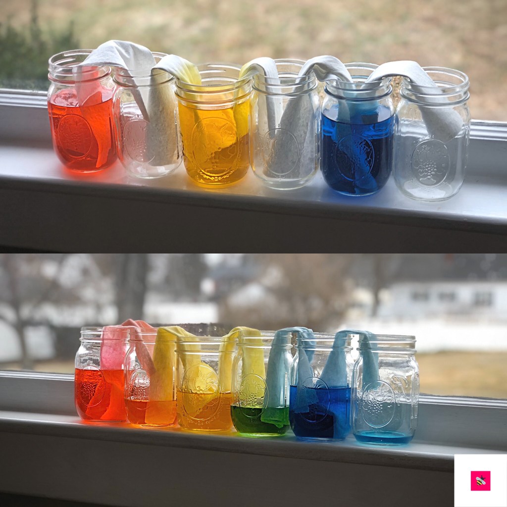 • Fill three jars with water to the brim and add primary food coloring (red, yellow, blue). Alternate water jars with empty jars. There should now be six jars total. Vertically fold 5 paper towels in half and cut an inch from the bottom of your paper towel. Place the end of your paper towel in your first jar (make sure it’s touching the bottom) and place the other end in jar next to it. Repeat until you have dipped the paper towels between all 6 jars (see picture). In a couple of hours check back to see your rainbow.