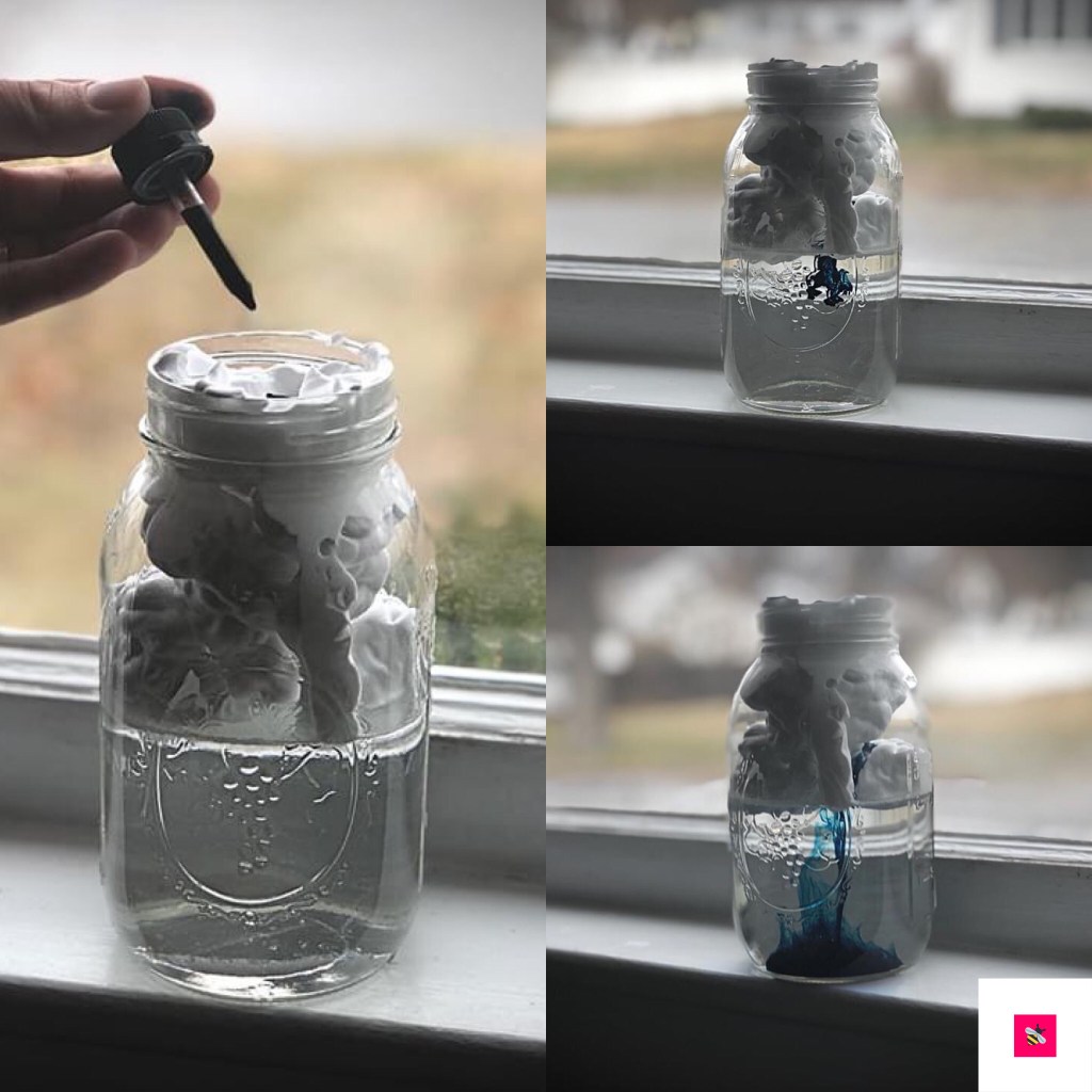 • Fill a mason jar just over half-way with water. On top of the water, use shaving cream to create a cloud. Drop blue food coloring into your cloud. When your cloud gets too full, the food coloring will fall to the bottom of the jar, replicating rain.