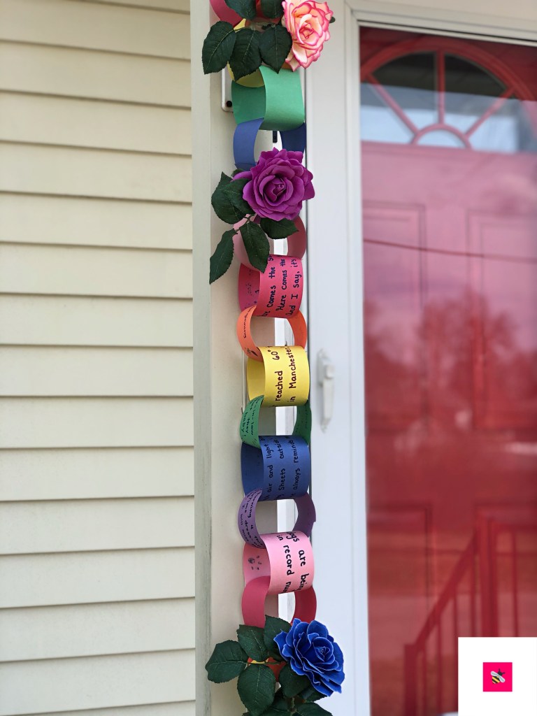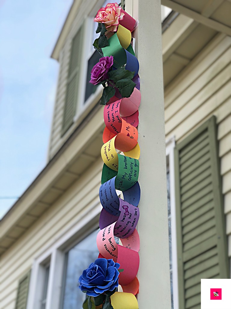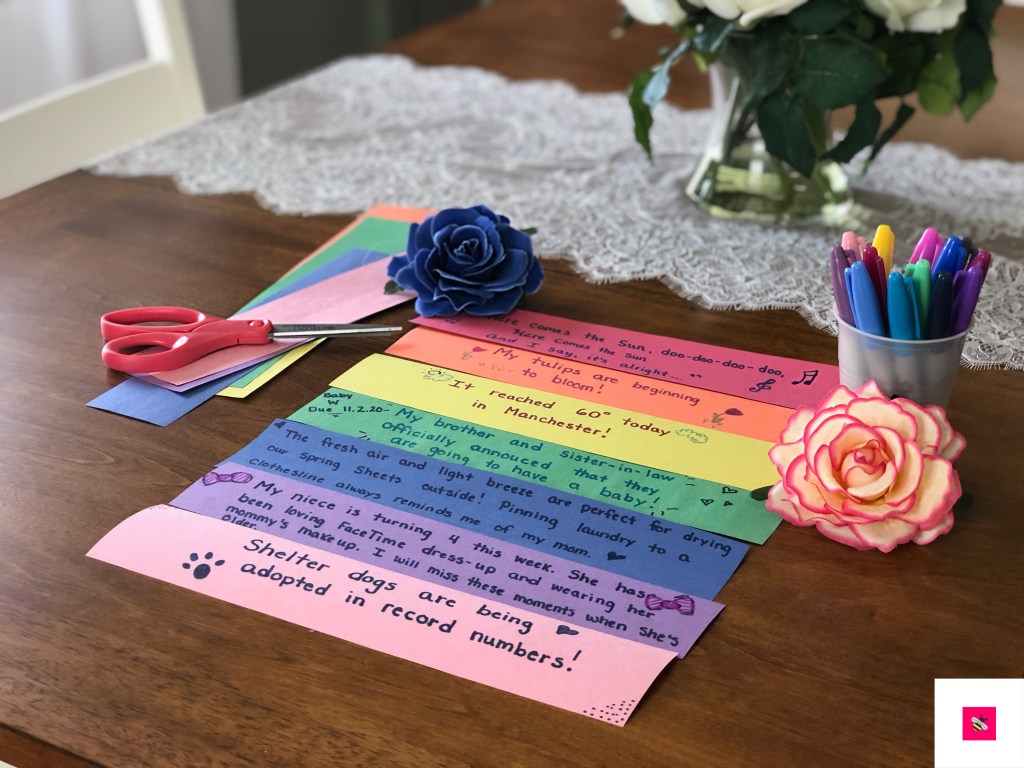 Build a chain with your family. Create links that are personal to you and your honeybee(s). A link for the kind act shown at the breakfast table. A link for the memory that Grandpa shared with you on the phone. A link with the lyrics you just can’t get out of your head. A link for the dog who is happy to have you home. A link for an optimistic thought that brought you peace of mind.