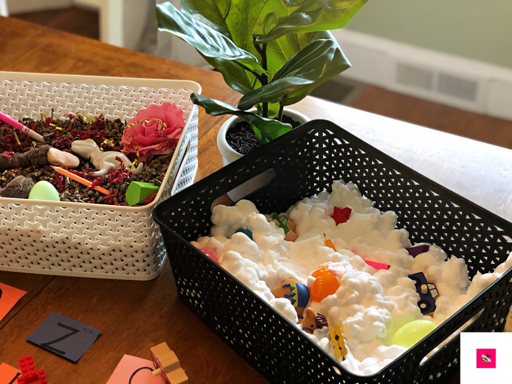 2. Determine which material you want to use to fill your bin and then bury toys with material
