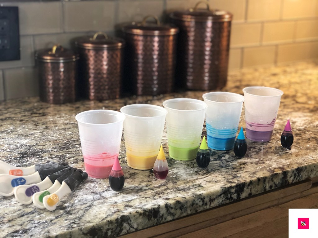 3. Add desired food coloring to cups (at least 4 drops)